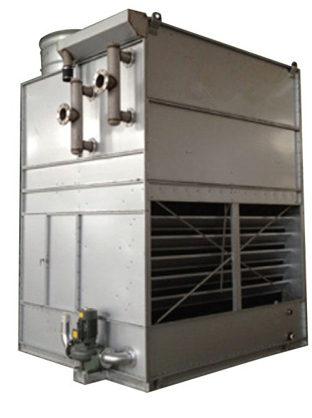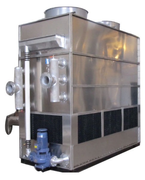工作流體(水、制冷劑、中冷液)在閉式冷卻塔的盤管內(nèi)進(jìn)行循環(huán),工作流體的熱量經(jīng)過盤管散入到噴淋在盤管表面的水膜中。同時(shí)機(jī)組外四周的空氣從塔底部進(jìn)風(fēng)格柵進(jìn)入,與水的的流動(dòng)主向正好相反,向上流經(jīng)盤管。一小部分水蒸發(fā)而吸收熱量,熱濕空氣由冷卻塔頂部的抽風(fēng)機(jī)排出到大氣中。其余的水落入底部水槽,由水泵再循環(huán)至水分配系統(tǒng)又噴淋到盤管上。